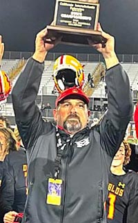 Mission Viejo head coach Chad Johnson raises CIF D1-AA state title trophy after 2023 triumph in championship game vs De La Salle. Photo: Mark Tennis.