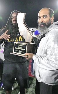 Grant of Sacramento co-coaches Syd’Quan Thompson (left) and Carl Reed get presented with CIF D2-AA state title trophy. Photo: Scott Kurtz / Cal-Hi Sports.