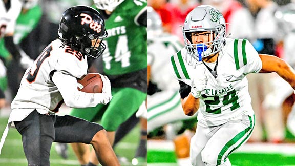 Kenny Ward of Pittsburg (left) looks for running group during CIF D1-AA state championship game. At right, Duece Jones-Drew also is shown in action during a CIF state title game (in his case Open Division). Photos: Scott Kurtz / Cal-Hi Sports.