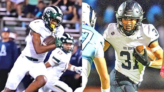 Gavin Williams from Damien of La Verne (left) makes a big play during game from last season. At right is RB Noah Penunuri of Rio Hondo Prep, who rushed for nearly 2,000 yards last season and had an injury in first game this season. Photos: Damien Football / Instagram.com & Tim Lunney / 210prepsports.com.