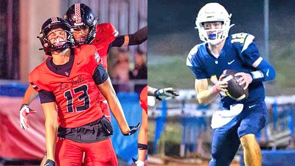 Carson Diehl of La Jolla (left) reacts after scoring one of the five TDs he had during win last week vs Patrick Henry. At right is Soquel QB Sam Whelan from a game last season. Photos: ljhsvikingsfb / Instagram.com & John Lee / Santa Cruz Sentinel.