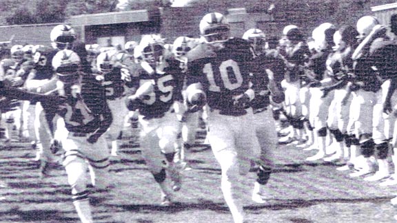 Cordova of 1975 quarterback Scott Jenner (10) leads team on a runout before one of its games. The Lancers from 50 years ago this season are still ranked among the greatest in state history. Photo: YouTube.com.