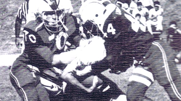 Max Venable (44) makes a big hit on an opposing running back for Cordova’s unbeaten 1975 team that stands as the best example of the Lancers going a national best 102-6-1 for the decade of the 1970s. Photo: YouTube.com.