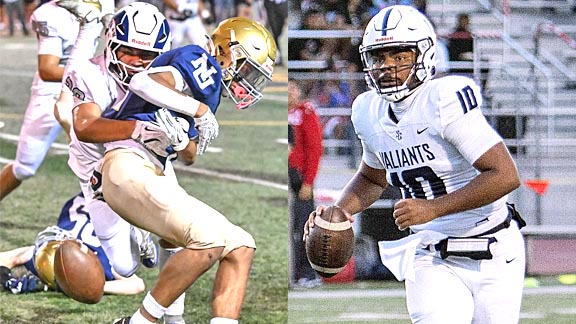 Can’t tell by the number but based on shoes he’s wearing, we’re pretty sure this is Casa Roble’s Dunedin Tupou (left) forcing a fumble in team’s win last week vs Nevada Union. At right is D1 quarterback recruit Michael Wynn from St. Genevieve of Panorama City. Photos: Orangevale Live / Facebook.com & @gens_football / X.com.