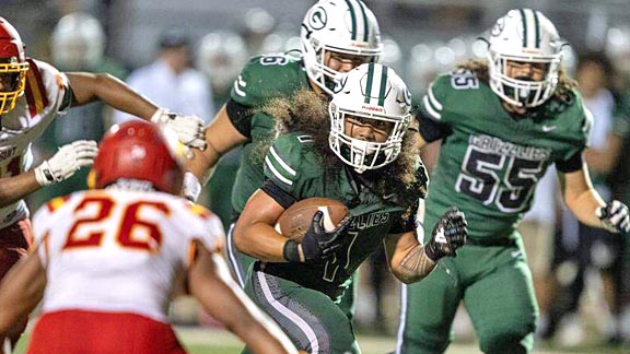 Four-year standout Isaiah Ene of new State TOP 50 ranked Granite Bay breaks into the clear for rushing yards in team’s win last week vs Jesuit of Carmichael. Photo: Jose Luis Villegas / Sacramento Bee.