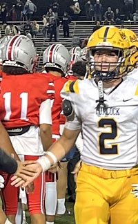 Turlock RB Kaleb Guinn leads the handshake line for his team after loss to Lincoln of Stockton on Friday. Photo: Mark Tennis.