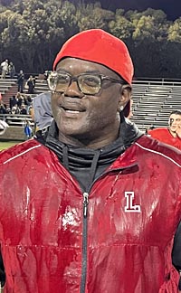 Head coach LaTef Grim of the Stockton Lincoln football team did get a Gatorade can dumped on him during postgame interview. Photo: Mark Tennis.