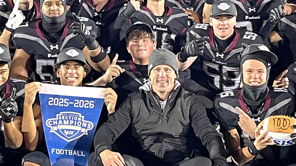 Woodcreek of Roseville head coach Kyle Stowers and team celebrate after the school earned its first-ever CIF Sac-Joaquin Section title in football. Photo: Mark Tennis.