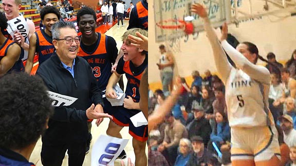 Rolling Hills Prep head coach Harvey Kitani (left) celebrates on the occasion of his 1,000th win after game on Jan. 23. At right, Lauren Harris of Yuba City Faith Lutheran shoots the three-pointer that she made last week that broke a national record. Photos: Nick Koza & ABC 10 Sports.